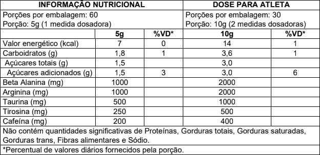 INGREDIENTES: Maltodextrina, beta alanina, L-arginina, L-taurina, L-tirosina, cafeína microencapsulada, aromatizante idêntico ao natural de maçã verde, acidulante ácido cítrico, antiumectante fosfato tricálcico, edulcorantes sucralose e acessulfame potássico e corante artificial verde folha. NÃO CONTÉM GLÚTEM.